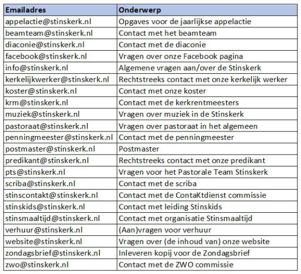 Voor contact met diverse geledingen binnen de Stinskerk zijn verschillende emailadressen aangemaakt: